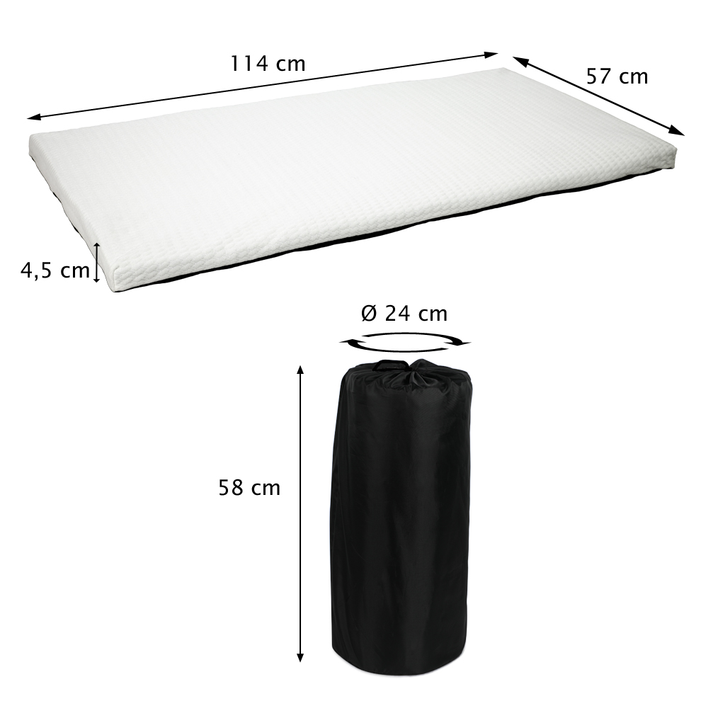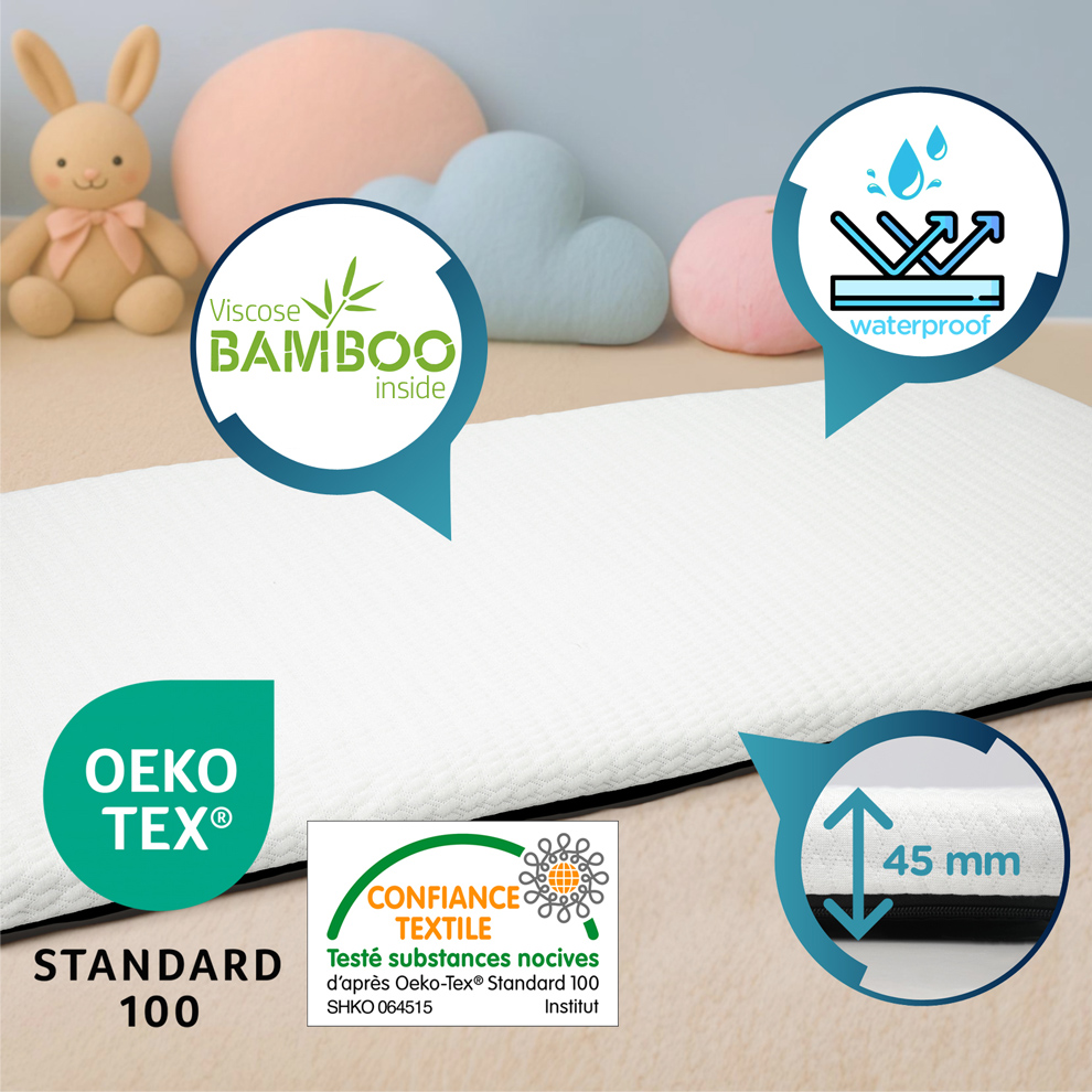 C’est un matelas épais de 45 mm qui vient s’ajouter au matelas-sommier (15 mm) du lit parapluie Renolux pour offrir un confort d’accueil total de 60 mm d’épaisseur, en toute sécurité. Le tissu de la housse en maille 3D ultra confortable est labellisé Oeko-Tex Standard 100 classe 1. Facile à transporter, le matelas est enroulable dans son sac baluchon.
